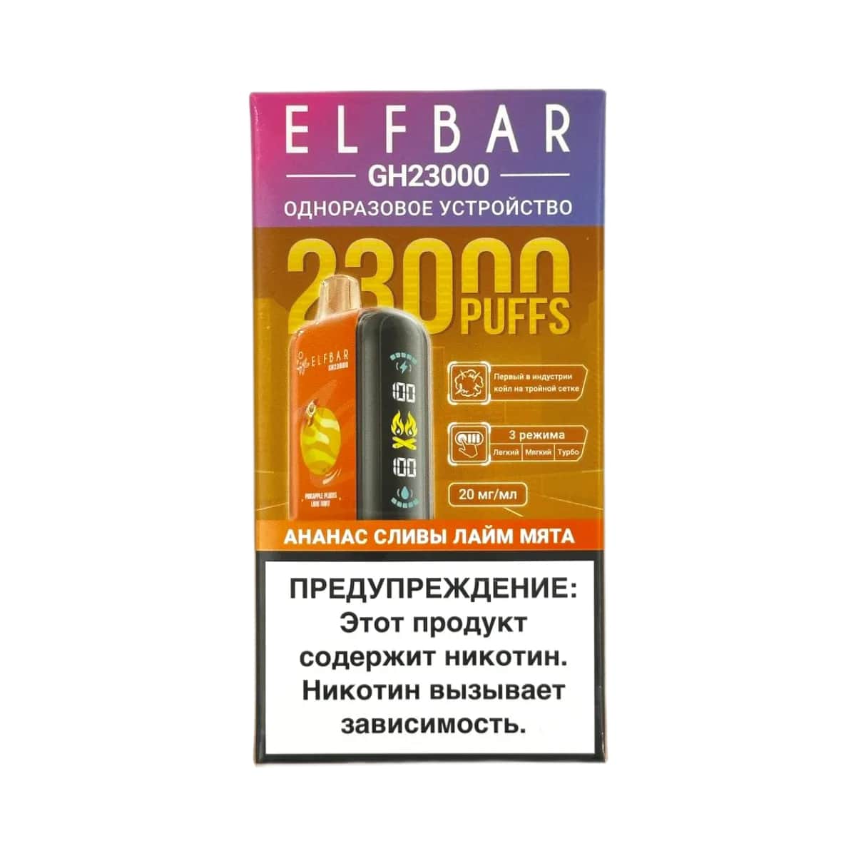 Одноразовые электронные сигареты ELFBAR GH23000 со вкусом Ананас Сливы Лайм Мята – это идеальное сочетание яркого вкуса, компактности и высокой производительности. Устройство оснащено емким аккумулятором на 850 mAh с функцией подзарядки через USB Type-C, а также большим баком на 23 мл с премиальной жидкостью.Солевой никотин крепостью 20 мг/мл (Normal обеспечивает мягкую и насыщенную затяжку, подходящую как для новичков, так и для опытных пользователей.