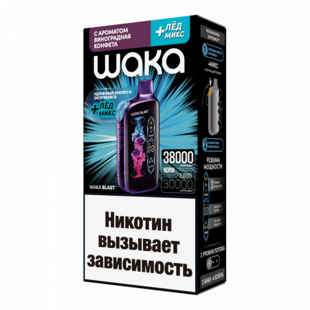 Закажите одноразовые электронные сигареты WAKA BLAST 38000 со вкусом Виноградная конфета+ Лёд МИКС и откройте для себя насыщенные вкусы с максимальным удобством!